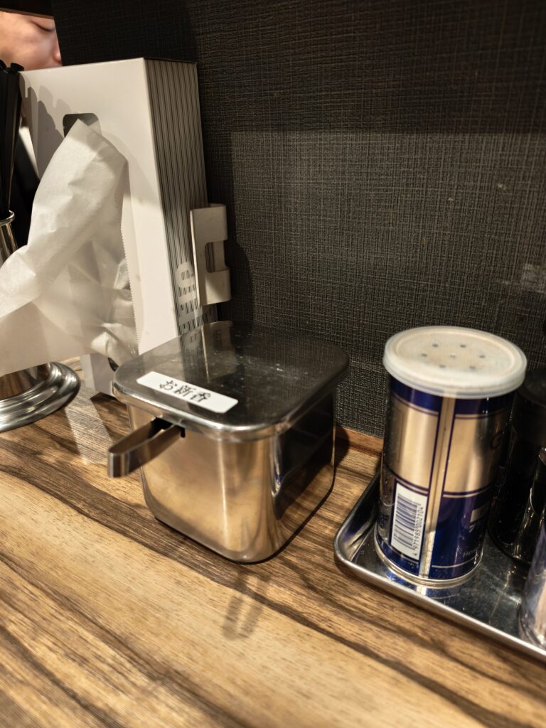 カウンターの前に並ぶ、家系ならではの調味料たち。